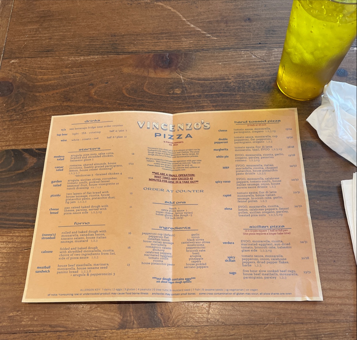 oil base pie with mozzarella, ricotta, lemon, calabrese peppers, fennel pollen, sicilian oregano, parsley, pine nuts. This item contains gluten, dairy, eggs, and nuts.